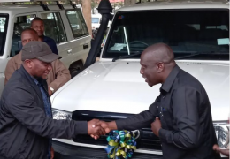 Waziri wa Nchi, Ofisi ya Rais Tawala za Mikoa na Serikali za Mitaa (TAMISEMI) Mhe. Mohamed Mchengerwa akimkabidhi gari Mkuu wa Wilaya Ya Mkalama, Mhe. Moses Machali kwa ajili ya Usimamizi Shirikis...
