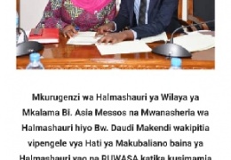Mkurugenzi Mtendaji Halmashauri ya wilaya ya Mkalama Bi.Asia Messos na Mwanasheria wa wilaya hii Bw.Daudi Makendi wakipitia vipengele vya Makubaliano ya Mkataba baina ya Halmashauri ya Mkalama na Ruwa...